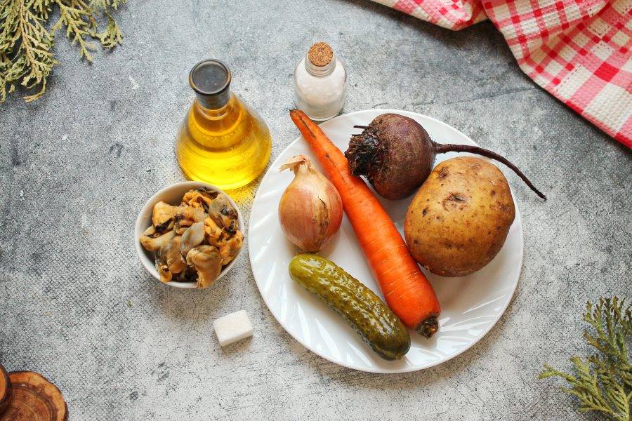 Подготовьте все необходимые ингредиенты для приготовления. Картофель, морковь и свеклу отварите или запеките до готовности и полностью остудите. Мидии отварите в солёной, кипящей воде в течение 2-3 минут, откиньте на сито и дайте полностью остыть.