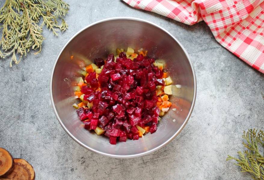 Свеклу очистите, порежьте средним кубиком, влейте оставшееся растительное масло и перемешайте. Добавьте свеклу к овощам, посолите и перемешайте.