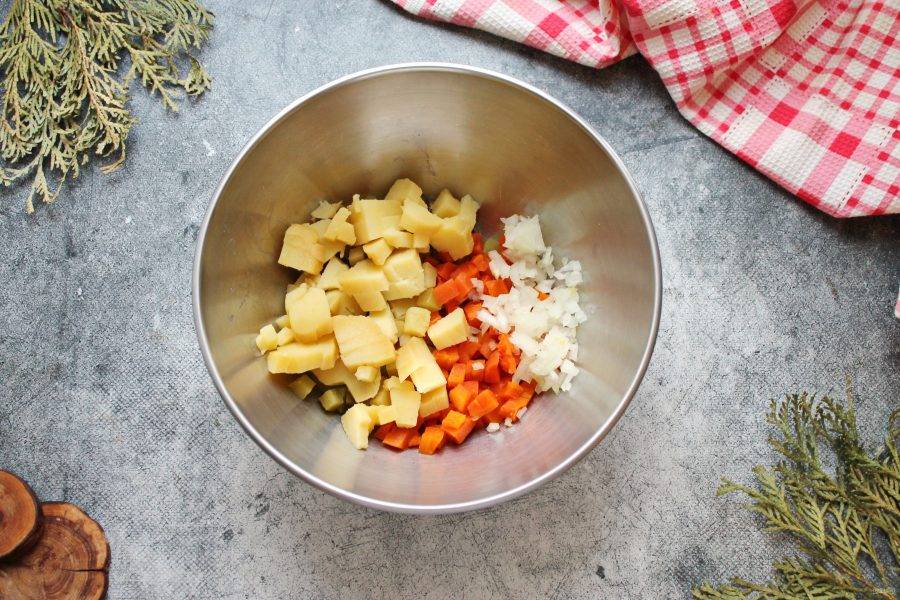 Репчатый лук почистите и мелко порежьте. Картофель очистите и порежьте средним кубиком. Выложите овощи в салатник. Влейте половину растительного масла, перемешайте.