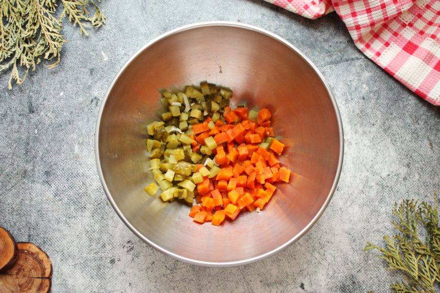 Морковь почистите и порежьте средним кубиком, выложите в салатник. Соленый огурец порежьте средним кубиком и добавьте к моркови.