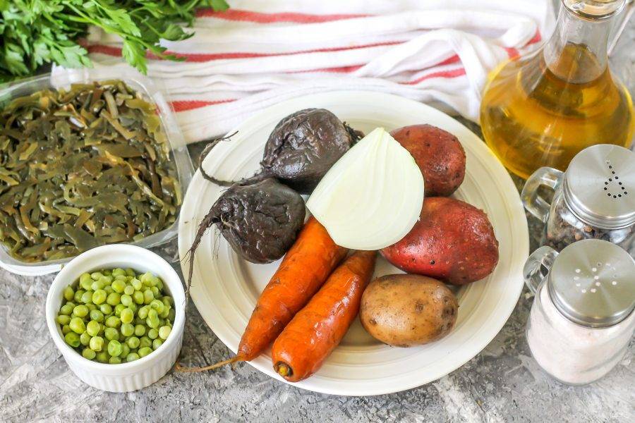 Подготовьте указанные ингредиенты. Заранее отварите свеклу, морковь и картофель в течение 30-40 минут и остудите.