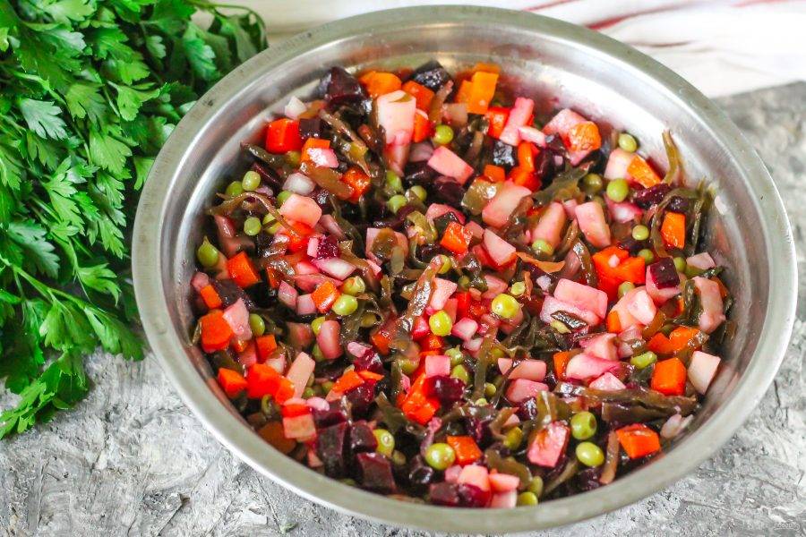 Если у вас нет в наличии соленых огурцов, приготовьте красочный и сочный винегрет с морской капустой! Такое блюдо получится не только вкусным, но еще и полезным, ведь в морской капусте содержится йод.