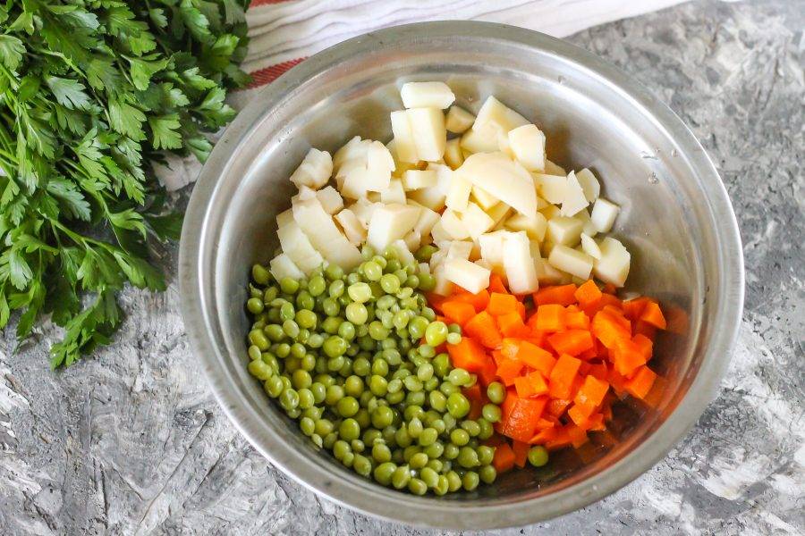 Очистите от кожуры отварные картофелины и морковь, промойте в воде и нарежьте мелкими кубиками. Высыпьте нарезку в салатник. Вскройте баночку с консервированным зеленым горошком, слейте маринад и выложите необходимую часть массы в емкость.