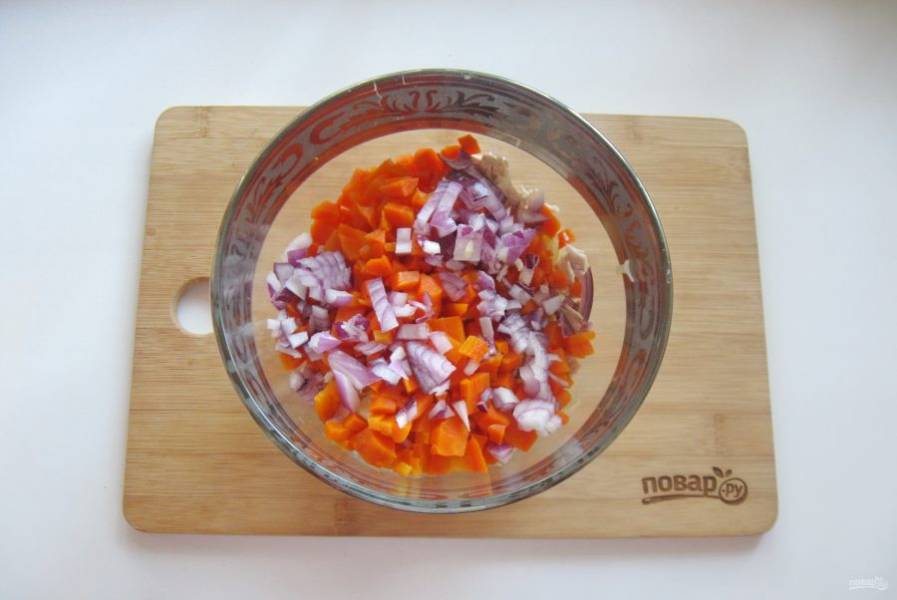 5. Красный или фиолетовый лук очистите, помойте и нарежьте мелко, выложите в салатник.