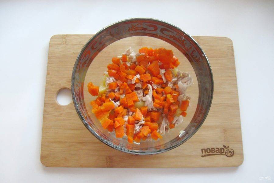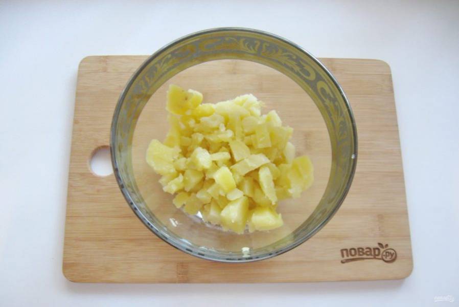 2. Картофель сварите в кожуре, охладите и очистите. После нарежьте кубиками и выложите в салатник.