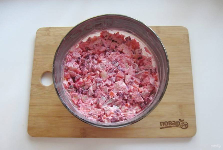 8. Винегрет посолите по вкусу и заправьте майонезом.