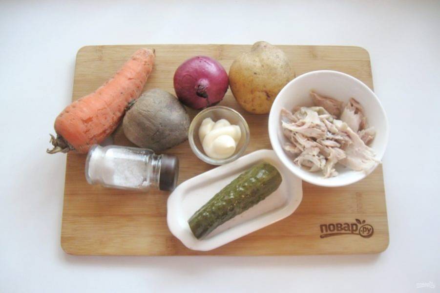 1. Подготовьте все продукты для винегрета. Отварите овощи до готовности, остудите и очистите.