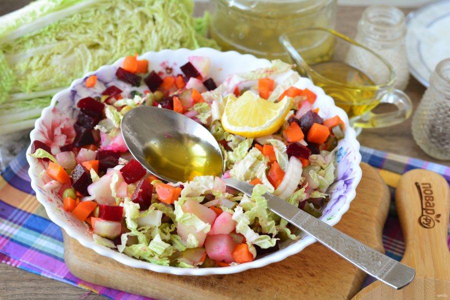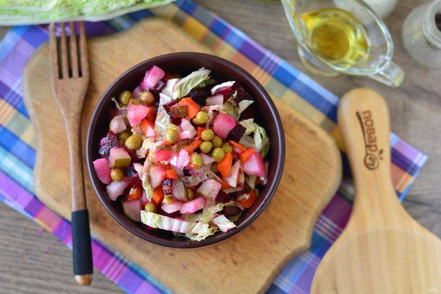 Когда у вас нет квашеной капусты для винегрета, то приготовьте такой салат с пекинской капустой. Получится вкусно, оригинально и просто.