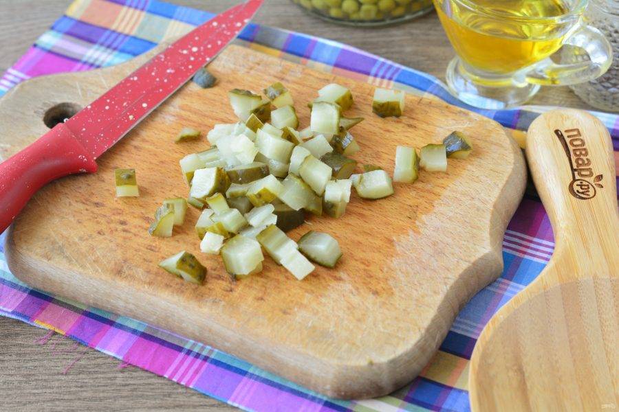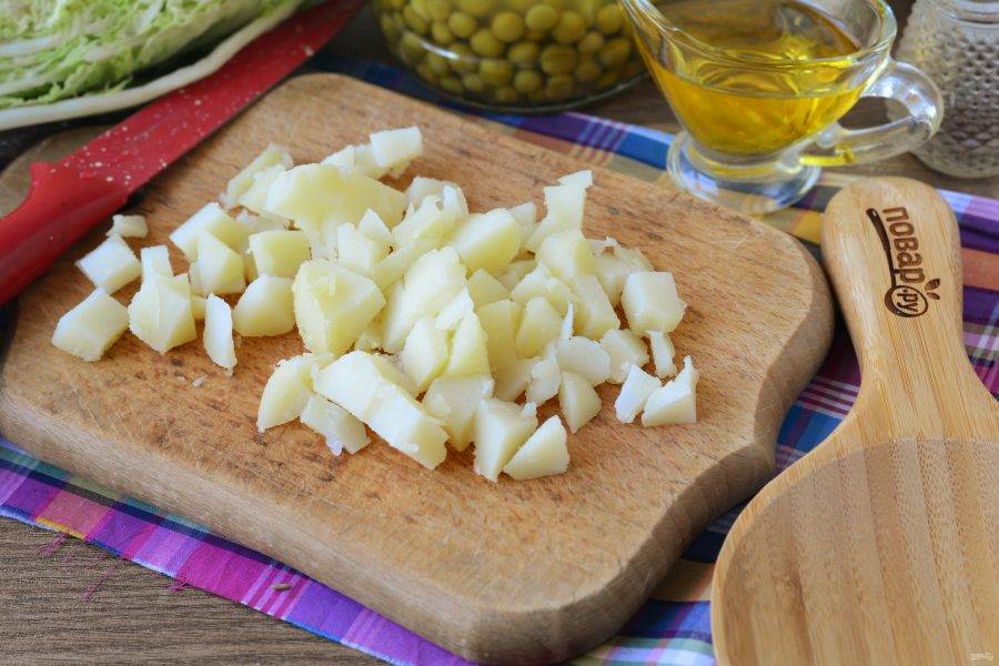 Отварите до мягкости картофель, остудите, почистите от кожуры, нарежьте кубиками.
