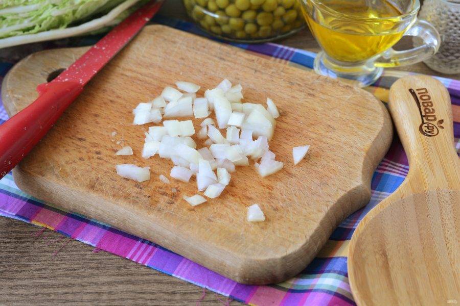 Почистите репчатый лук и накрошите мелкими кубиками.