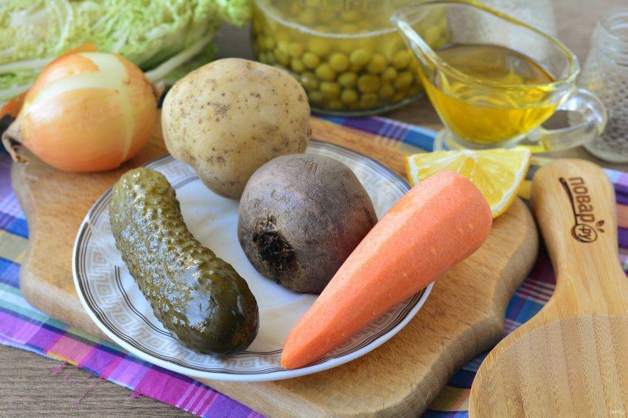 Винегрет — классический овощной салат, рецепт которого передается из поколения в поколение. Рецепт салата включает в себя свеклу, картофель, морковь, капусту, зеленый горошек и свежий репчатый лук.