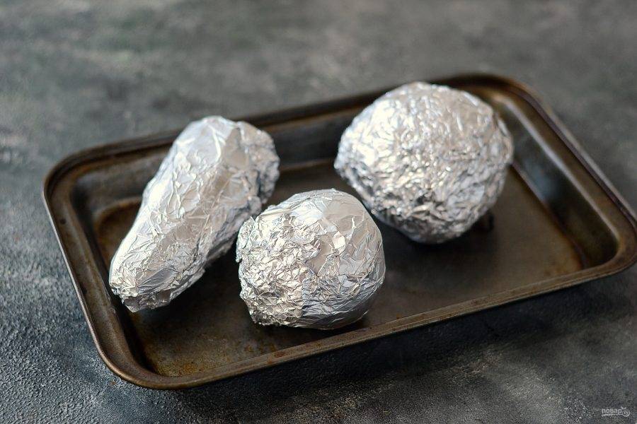 Свеклу и морковь тщательно помойте, обсушите и заверните в фольгу. Запеките до мягкости при температуре 200 градусов. Морковь будет готова за 45-50 минут, свекла за 1-1,5 часа.