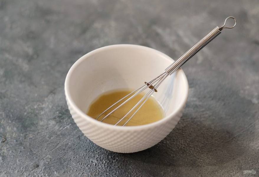 Для заправки смешайте растительное масло, уксус и горчицу. Приправьте сахаром и солью, взбейте венчиком до однородной консистенции.