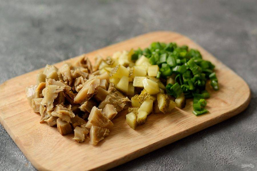 Нарежьте грузди и огурцы на кубики среднего размера, зеленый лук мелко порубите.