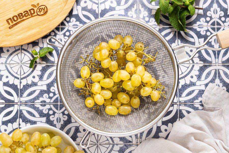 Виноград помойте, откиньте на сито и дайте стечь лишней воде.