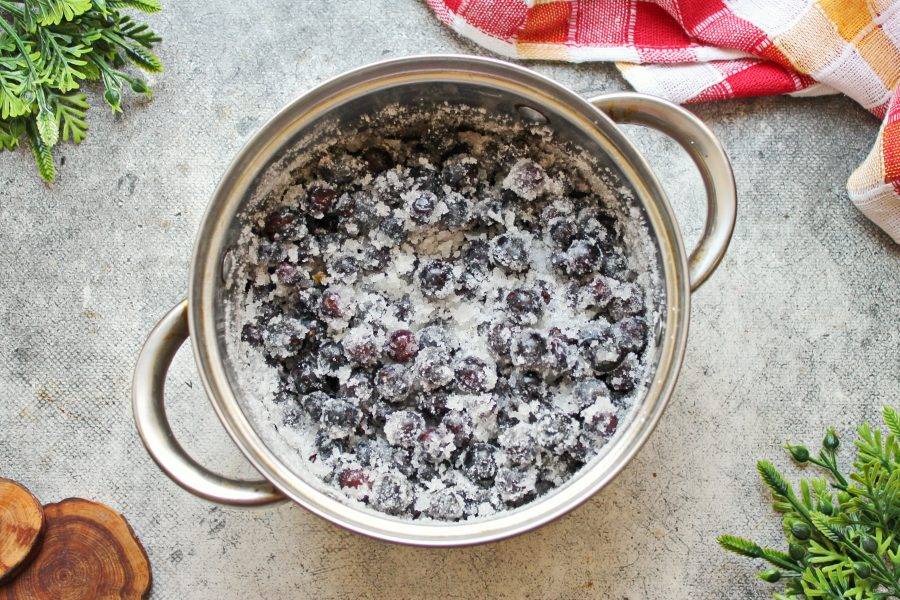 Переложите ягоды винограда в кастрюлю с толстым дном или в таз для варки, пересыпая сахаром.