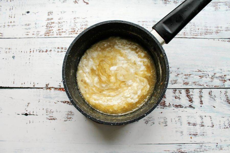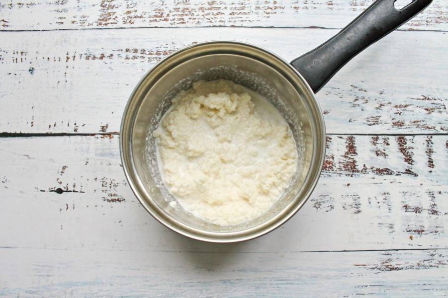Желатин насыпьте в сотейник с толстым дном и залейте 20% сливками. Оставьте для набухания на 30 минут.