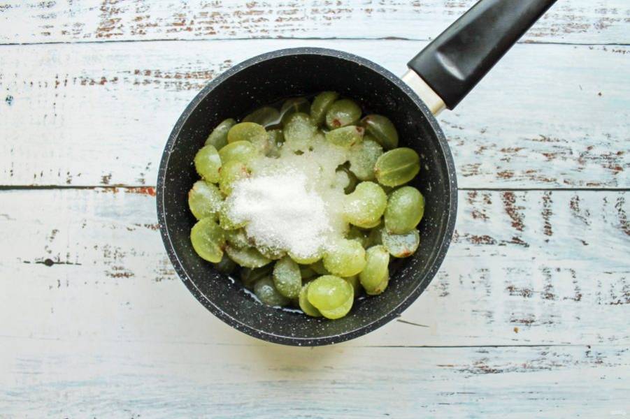 В другой сотейник выложите виноград, разрезанный пополам, влейте вино и добавьте сахар.