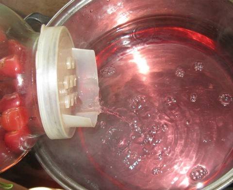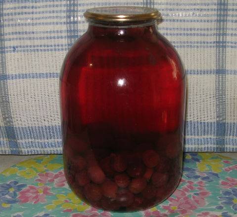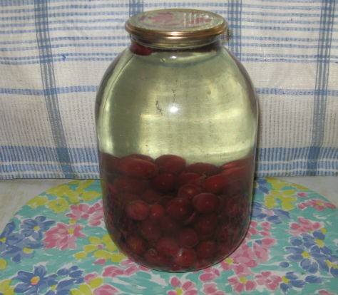 6. Заливаем обратно в бутыль и закатываем стерилизованной крышкой. Переворачиваем банку и укрываем. После полного остывания (через день-два) оправляем вишневый компот в кладовую или погреб.