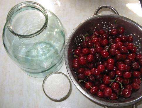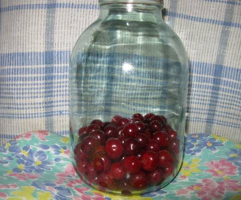 2. Берем чистый стерилизованный бутыль и засыпаем в него вишню (чтобы она заняла треть банки).