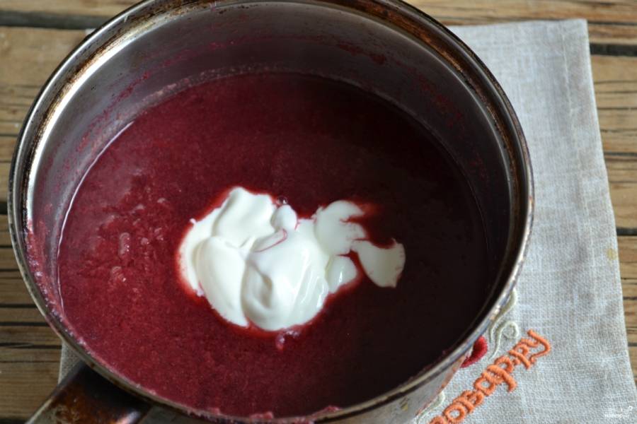 К слегка остывшей вишне добавьте сметану, хорошенько перемешайте ложкой или миксером.