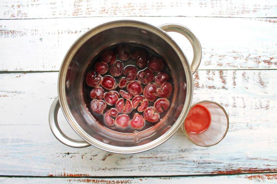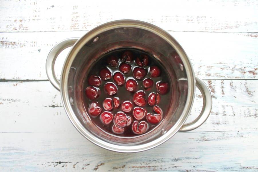 У вишни удалите хвостики и косточки. Выложите ягоды в кастрюлю с толстым дном, всыпьте сахар и влейте вино.
