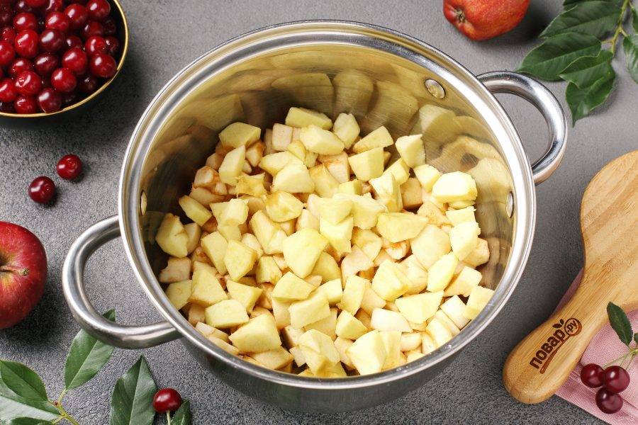 Яблоки очистите от кожуры, удалите сердцевину и нарежьте небольшими кубиками.
