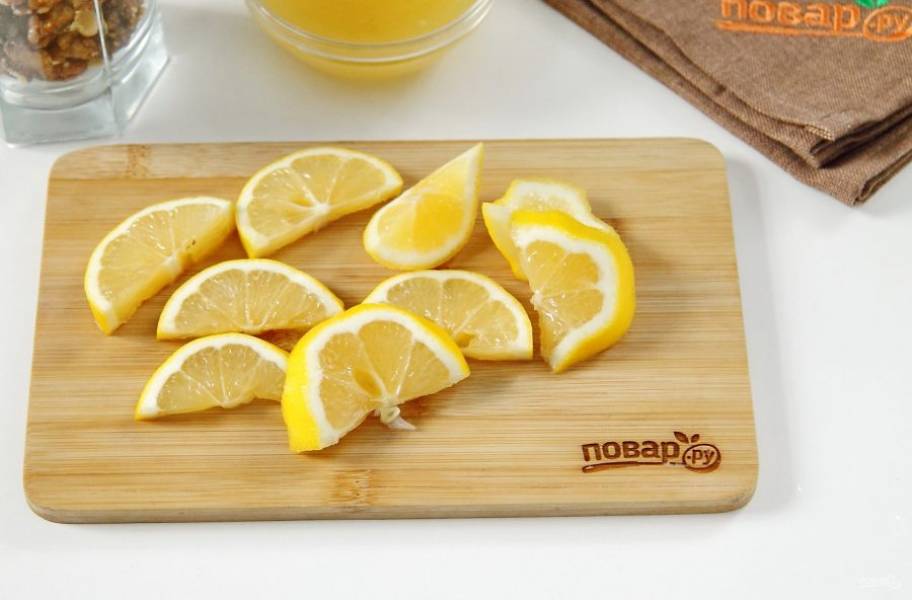 Лимон хорошо помойте, нарежьте кружочками, а затем каждый кружок пополам. Удалите косточки.