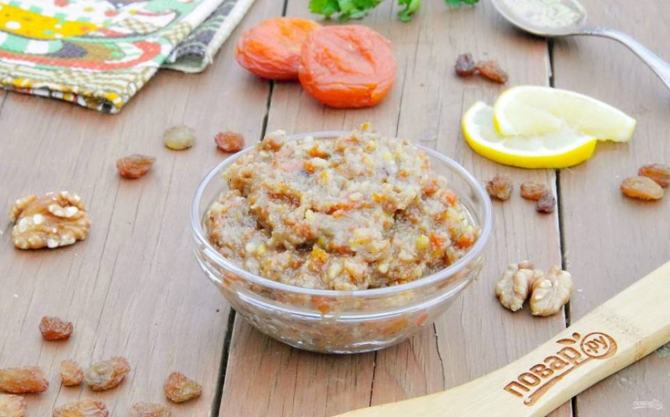 Паста Амосова — это смесь из сухофруктов с грецкими орехами, мёдом и лимоном. В ней содержится большое количество витаминов и минералов. Берите на заметку рецепт!
