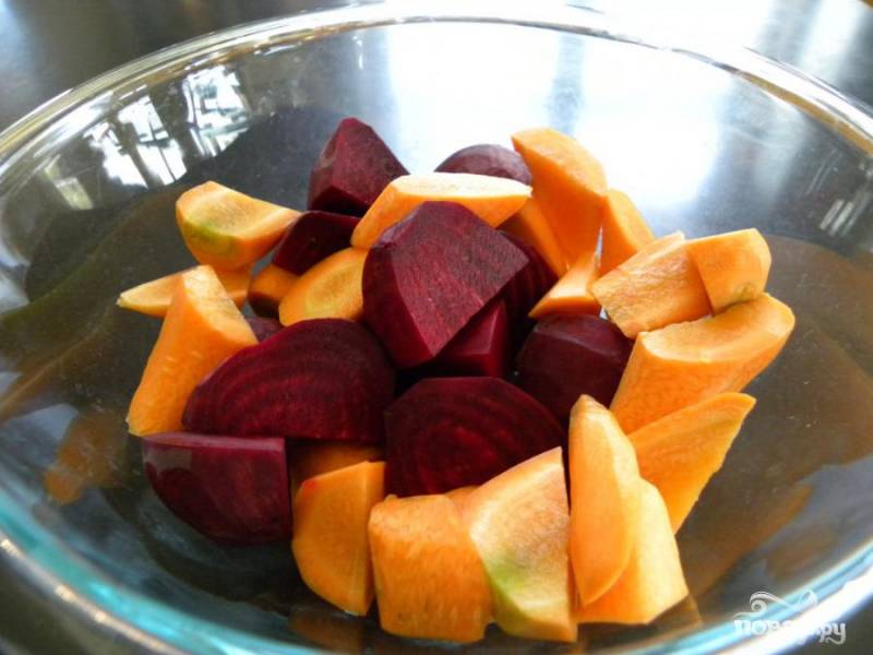 2. Тщательно вымойте и очистите свеклу и морковь, порежьте на кусочки произвольной формы.