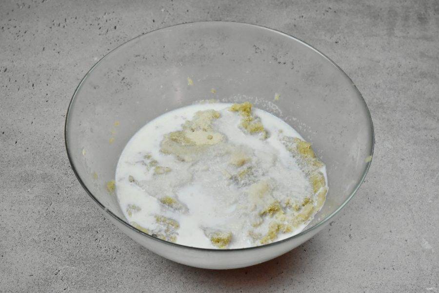 Сливки подогрейте в микроволновой печи в течение одной минуты и влейте в рыбный фарш.