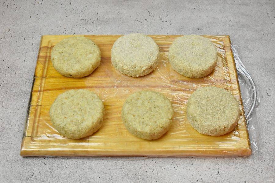Сформируйте котлеты массой 100-110 граммов. Каждое изделие обваляйте в сухарях.