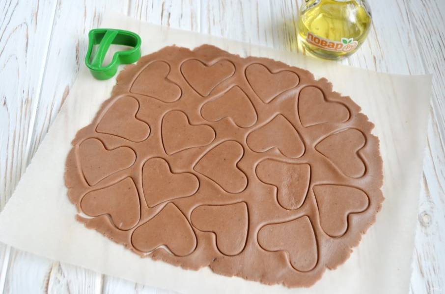 Включите духовку на 180 градусов, пусть прогревается. Отрежьте половину теста, раскатайте тонко, примерно 2 мм в толщину, это удобно делать сразу на пергаменте, чтобы не переносить потом печенье. Вырубкой вырезайте фигурки на небольшом расстоянии друг от друга.
