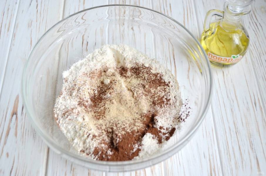 Соедините все сухие ингредиенты, исключая сахарную пудру. Перемешайте очень тщательно, чтобы не попадались комочки специй или какао. Используйте соду или разрыхлитель, у меня он домашнего производства из соды и лимонной кислоты.