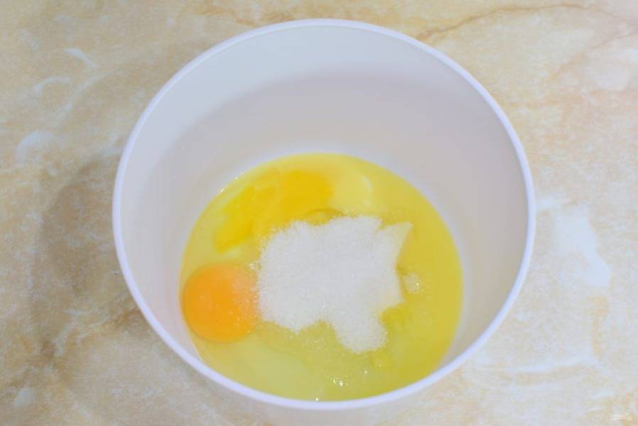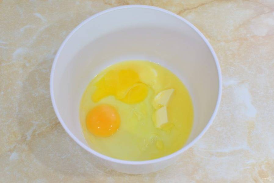В чашу выложите сливочное масло и подогрейте его в микроволновой печи, чтобы оно стало мягкое. Можно даже его полностью растопить. Добавьте к маслу яйца.