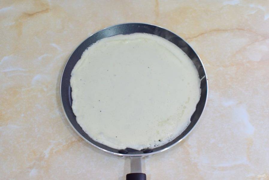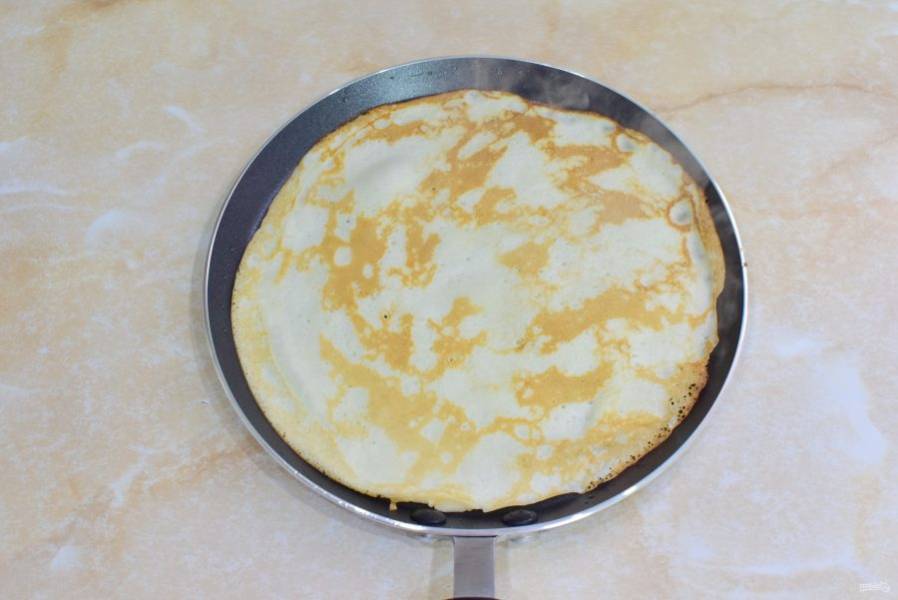 Горячую сковороду смажьте сливочным маслом. Налейте тонким слоем тесто и готовьте его с двух сторон.