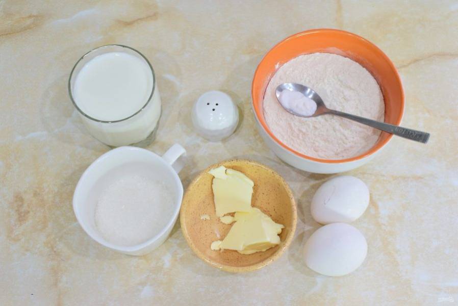 Для приготовления блинчиков подготовьте необходимые ингредиенты. Молоко подогрейте до теплого состояния.