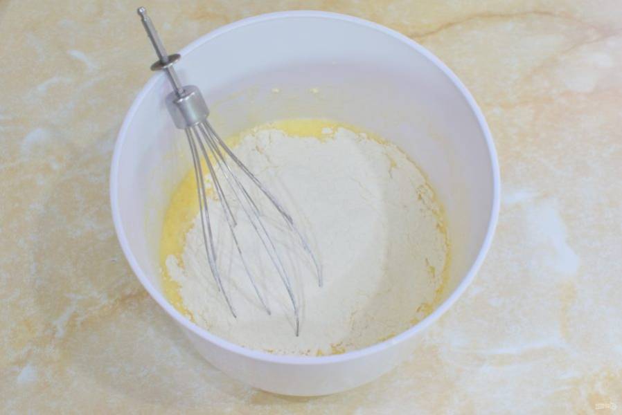 Постепенно подсыпайте просеянную муку и вмешивайте её в тесто.