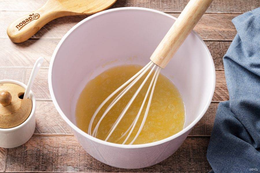 В глубокой миске взбейте яйцо с сахаром и солью.
