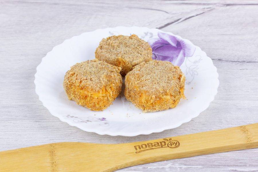 Берите массу объемом 1 ст. л. и формируйте небольшую котлетку, обваляйте в панировочных сухарях.