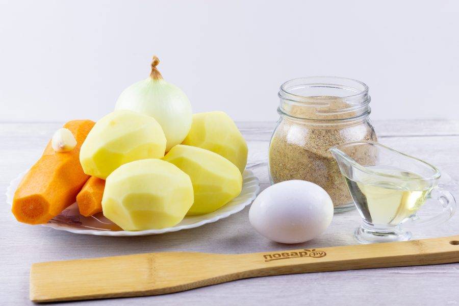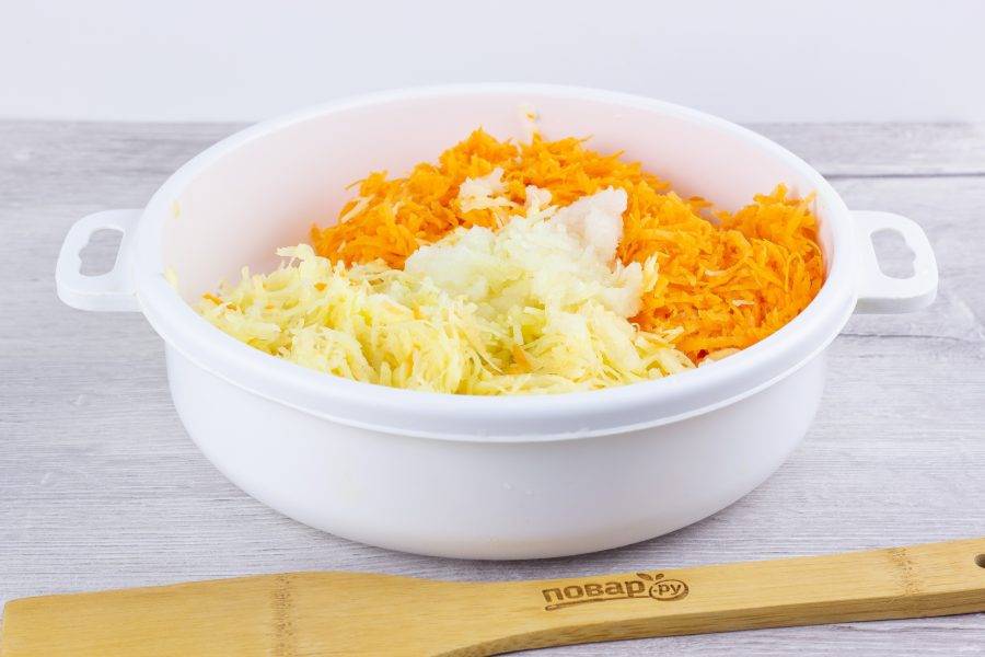 Картофель, морковь, лук и чеснок натрите на мелкой терке.