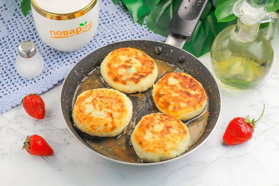 Прогрейте сковороду с растительным маслом и сразу же убавьте нагрев до умеренного. Выложите сырники в масло и поджарьте примерно 3-4 минуты.