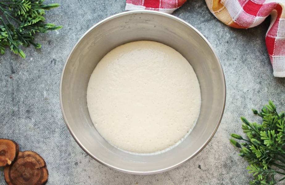 Миску с будущей опарой покройте и поставьте в теплое место на 30 минут. За это время дрожжи начнут работать, масса станет воздушной и увеличится в 2-2.5 раза.