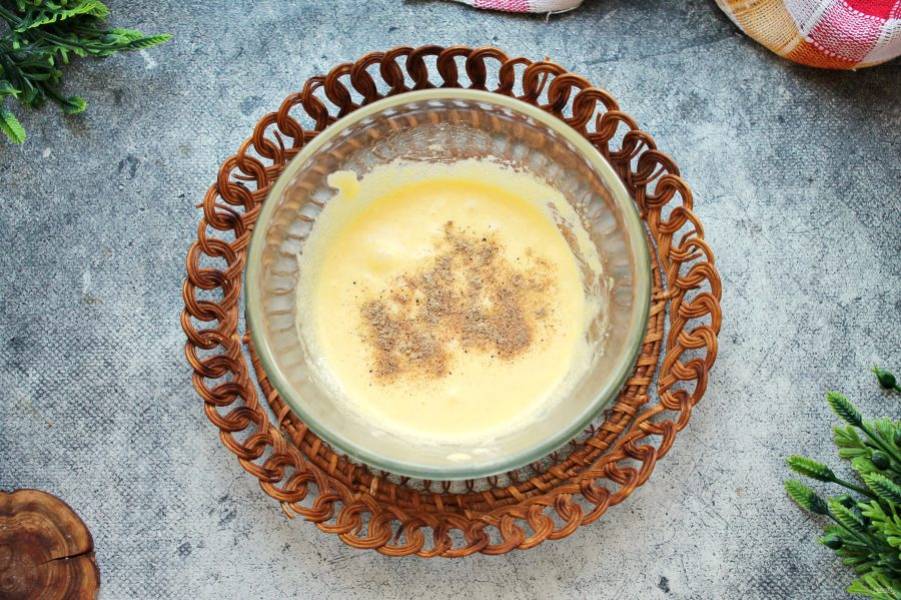 Пока опара поднимается, продолжите приготовление. Разделите белки от желтков, так, чтобы в белки не попало ни капли желтка. Белки отставьте, они понадобятся позже. Желтки соедините с оставшимся сахаром и разотрите в пышную пену. Добавьте специи, у меня кардамон и мускатный орех, перемешайте.