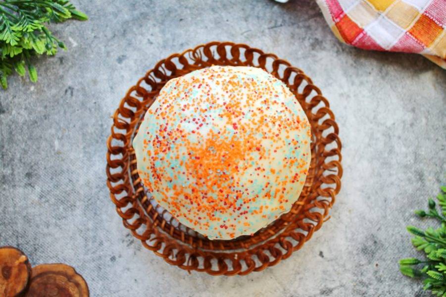 Нанесите глазурь на теплые куличи и украсьте по своему желанию.