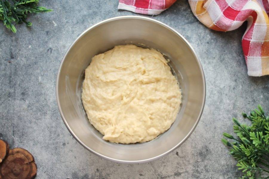 В опару просейте муку и замесите мягкое, слегка липкое тесто. Смажьте руки растительным маслом, сформируйте из теста шар, выложите в глубокую миску и покройте. Уберите тесто в теплое место на 50-60 минут, за это время тесто подойдет и увеличится в два раза.