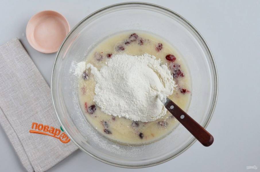 Добавьте муку и разрыхлитель, хорошо перемешайте.