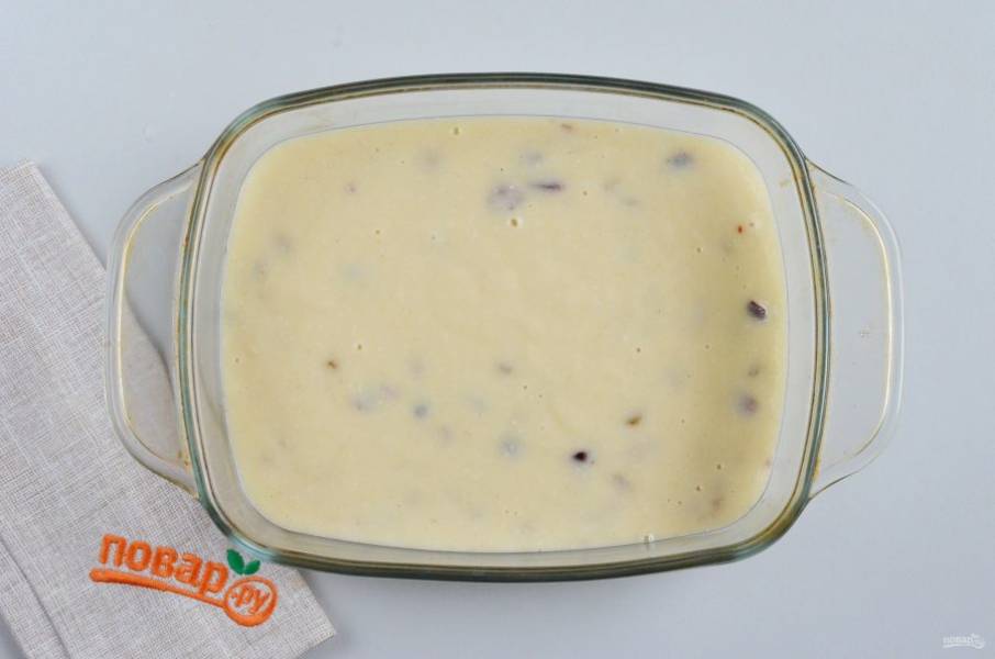 Смажьте форму для манника маслом, перелейте тесто и отправьте в горячую духовку на 40 минут.
