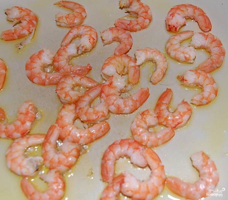 Теперь пришло время заняться креветками. Разогрейте сковороду с оливковым маслом и выложите туда креветки. Обжарьте их втечение трёх минут. Затем выложите на бумажное полотенце, чтобы убрать лишнее масло.