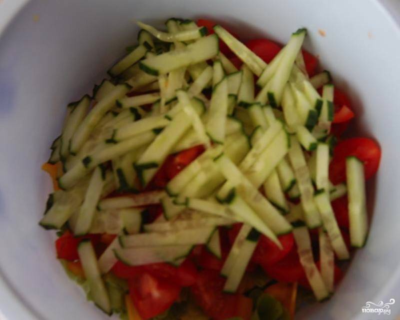 Все овощи нарежьте небольшими кусочками. Обычно я режу помидоры черри четвертинками, а огурец — мелкой соломкой. Салатные листья порвите руками на небольшие кусочки. Перемешайте овощи и добавьте к ним немного лимонного сока.